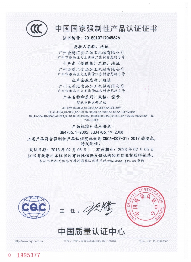 | Authority: | China Quality Certification Center | From: | 2018-02-05 |